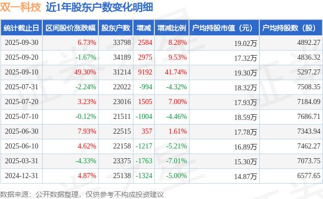 从股价来看,2025年9月10日至2025年9月30日,双一科技区间涨幅为6.73%,在此期间股东户数增加2584.0户,增幅为8.28%。