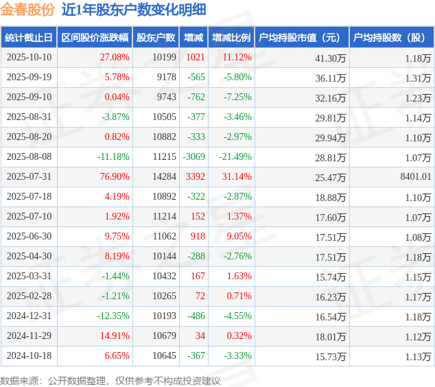 从股价来看,2025年9月19日至2025年10月10日,金春股份区间涨幅为27.08%,在此期间股东户数增加1021.0户,增幅为11.12%。