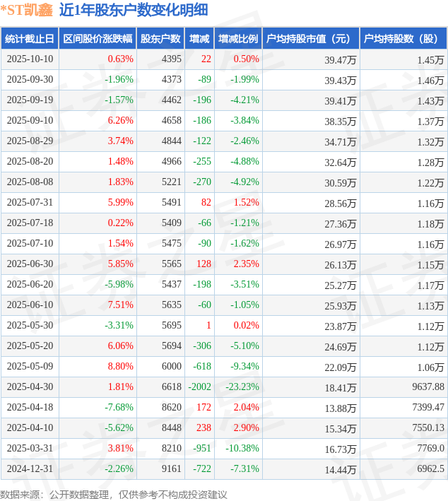 从股价来看,2025年9月30日至2025年10月10日,*ST凯鑫区间涨幅为0.63%,在此期间股东户数增加22.0户,增幅为0.5%。