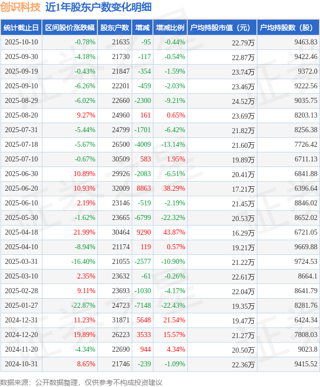 从股价来看,2025年9月30日至2025年10月10日,创识科技区间跌幅为0.78%,在此期间股东户数减少95.0户,减幅为0.44%。