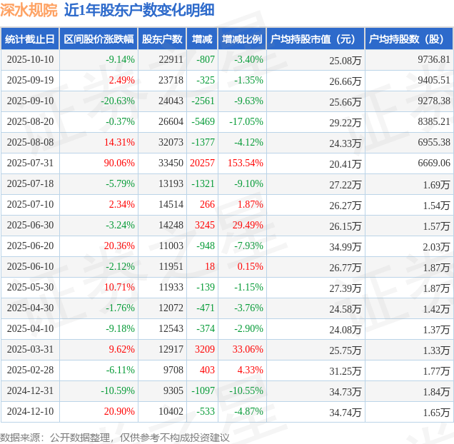 从股价来看,2025年9月19日至2025年10月10日,深水规院区间跌幅为9.14%,在此期间股东户数减少807.0户,减幅为3.4%。