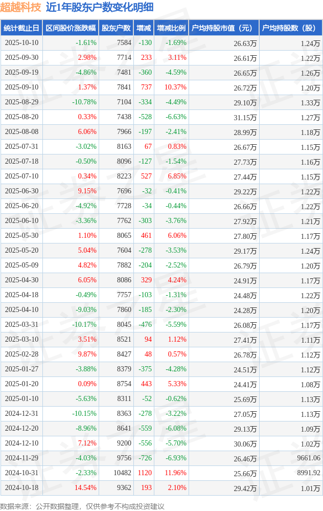 从股价来看,2025年9月30日至2025年10月10日,超越科技区间跌幅为1.61%,在此期间股东户数减少130.0户,减幅为1.69%。