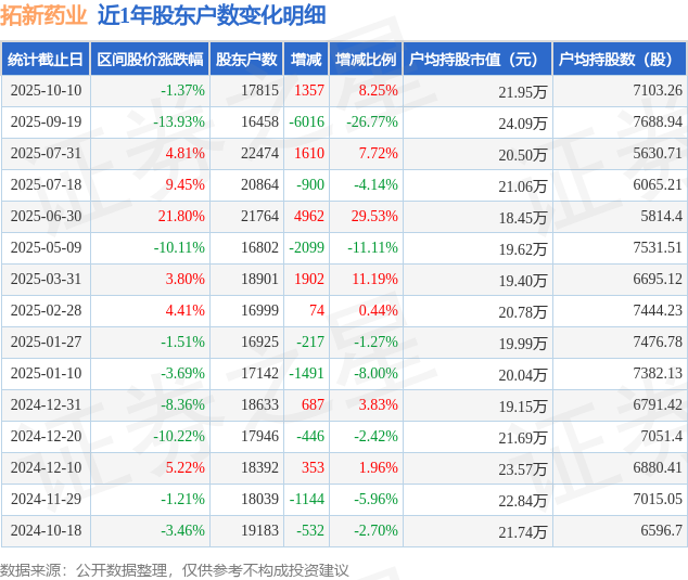 从股价来看,2025年9月19日至2025年10月10日,拓新药业区间跌幅为1.37%,在此期间股东户数增加1357.0户,增幅为8.25%。