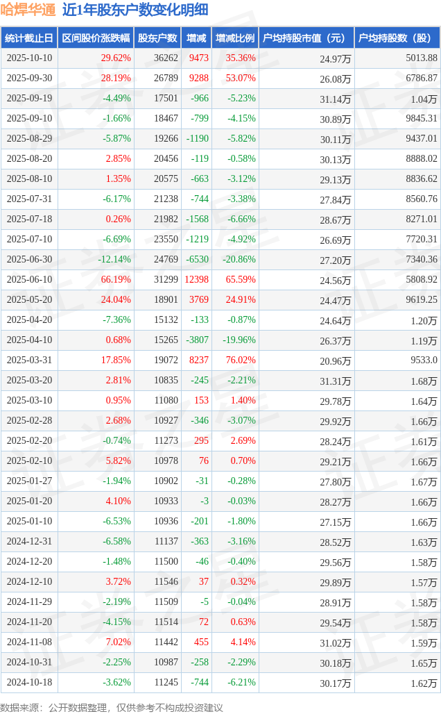 从股价来看,2025年9月30日至2025年10月10日,哈焊华通区间涨幅为29.62%,在此期间股东户数增加9473.0户,增幅为35.36%。