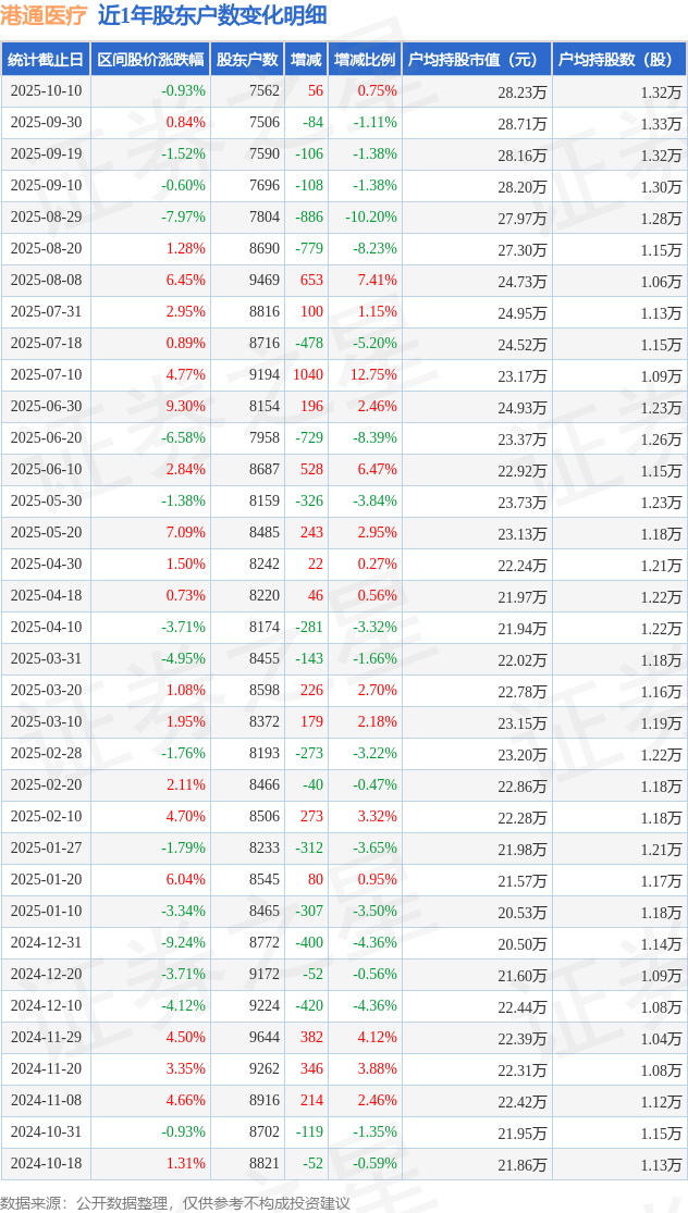 从股价来看,2025年9月30日至2025年10月10日,港通医疗区间跌幅为0.93%,在此期间股东户数增加56.0户,增幅为0.75%。