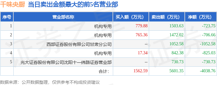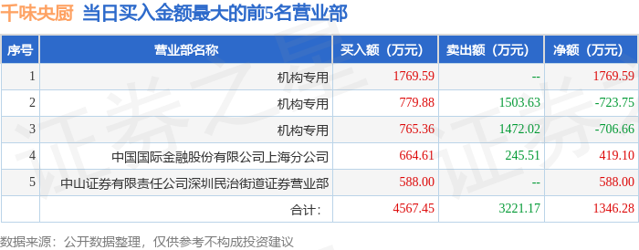 证券之星消息,沪深交易所2025年10月14日公布的交易公开信息显示,千味央厨(001215)因日跌幅偏离值达到7%的前5只证券登上龙虎榜。此次是近5个交易日内第1次上榜。
