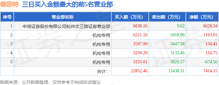 证券小知识:龙虎榜是交易所披露的竞价交易公开信息,现身龙虎榜的个股都是当日最为活跃的个股,是投资者日常重点关注的数据。交易所公布当日买入金额和卖出金额前五名的席位,其中一些席位代表特殊意义,如机构专用席位是指基金专用席位、券商自营专用席位、社保专用席位、券商理财专用席位、保险机构专用席位、保险机构租用席位、QFII专用席位等机构投资者买卖证券的专用通道和席位。深股通专用、沪股通专用为北向资金的交易席位。从龙虎榜数据可以发现和研究机构、游资和散户的资金动向。一些营业部席位经常上榜,市场知名度较高,投资者整理代表散户、游资、量化等不同资金的营业部席位。