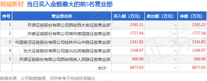 证券之星消息,沪深交易所2025年10月14日公布的交易公开信息显示,冠城新材(600067)因有价格涨跌幅限制的日收盘价格涨幅偏离值达到7%的前五只证券登上龙虎榜。此次是近5个交易日内第1次上榜。