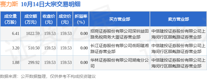 证券之星消息,10月14日赛力斯发生大宗交易,交易数据如下:
