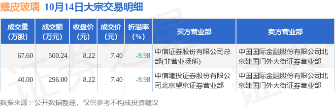 证券之星消息,10月14日耀皮玻璃发生大宗交易,交易数据如下: