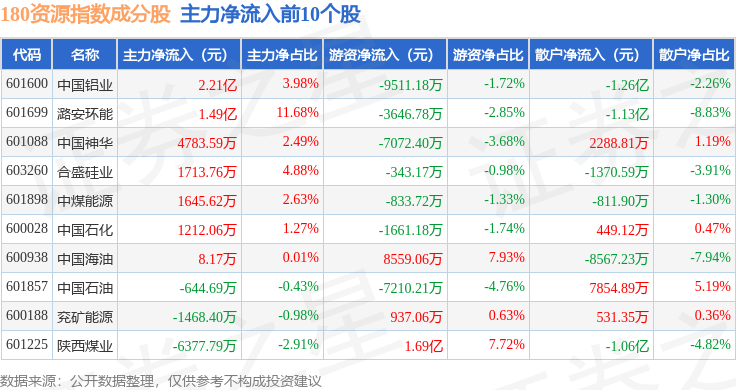 资金流向方面,180资源(000026)指数成份股当日主力资金净流出合计58.53亿元,游资资金净流入合计12.7亿元,散户资金净流入合计45.83亿元。成份股资金流向详情见下表: