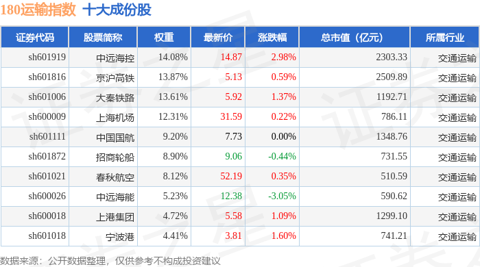 证券之星消息,10月14日,180运输(000027)指数报收于766.0点,涨0.79%,成交84.49亿元,换手率0.63%。当日该指数成份股中,上涨的有10家,中远海控以2.98%的涨幅领涨,下跌的有2家,中远海能以3.05%的跌幅领跌。