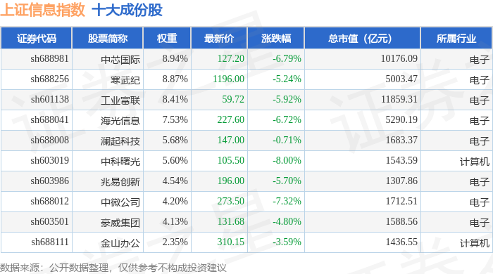 证券之星消息,10月14日,上证信息(000039)指数报收于5581.96点,跌5.11%,成交1710.82亿元,换手率2.82%。当日该指数成份股中,上涨的有2家,中国软件以2.23%的涨幅领涨,下跌的有48家,华海清科以10.33%的跌幅领跌。