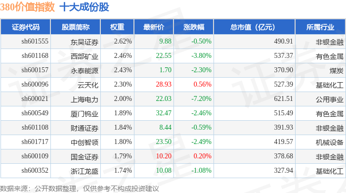 证券之星消息,10月14日,380价值(000118)指数报收于9998.88点,跌0.15%,成交595.91亿元,换手率2.1%。当日该指数成份股中,上涨的有73家,山煤国际以5.12%的涨幅领涨,下跌的有42家,上海电力以7.2%的跌幅领跌。