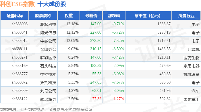 证券之星消息,10月14日,科创ESG(000691)指数报收于1491.87点,跌4.04%,成交718.07亿元,换手率2.01%。当日该指数成份股中,上涨的有9家,禾迈股份以1.95%的涨幅领涨,下跌的有41家,华海清科以10.33%的跌幅领跌。