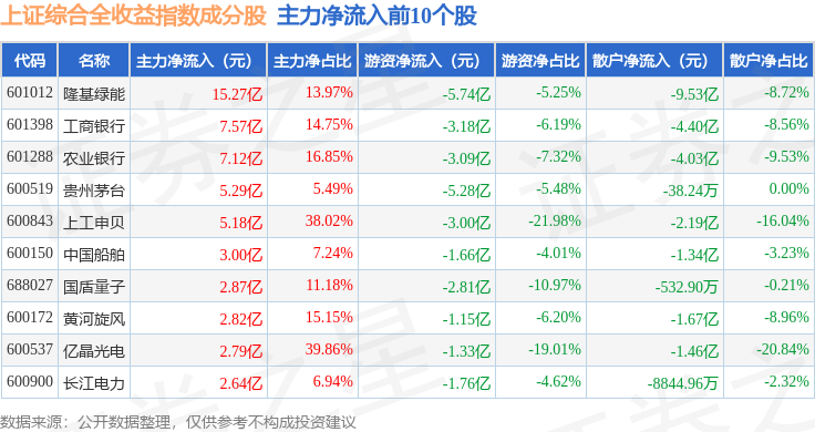 资金流向方面,上证综合全收益(000888)指数成份股当日主力资金净流出合计448.69亿元,游资资金净流入合计110.51亿元,散户资金净流入合计338.18亿元。成份股资金流向详情见下表: