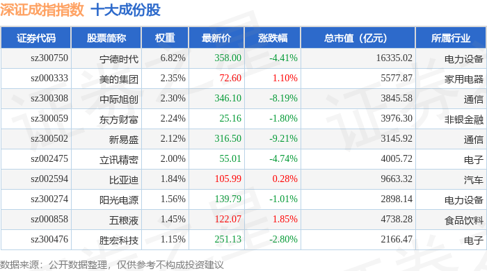 资金流向方面,深证成指(399001)指数成份股当日主力资金净流出合计409.07亿元,游资资金净流入合计114.84亿元,散户资金净流入合计294.23亿元。成份股资金流向详情见下表: