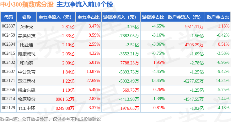 资金流向方面,中小300(399008)指数成份股当日主力资金净流出合计173.59亿元,游资资金净流入合计33.58亿元,散户资金净流入合计140.01亿元。成份股资金流向详情见下表: