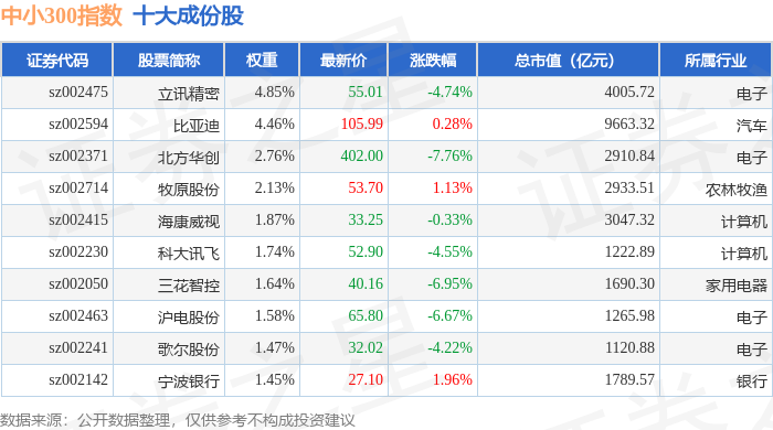中小300(399008)指数十大成份股详情如下: