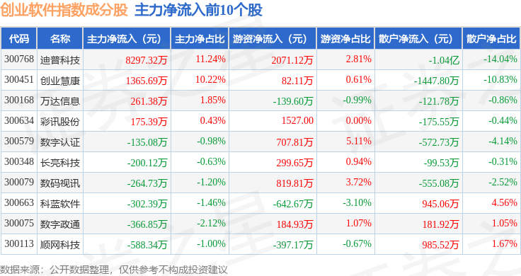 资金流向方面,创业软件(399264)指数成份股当日主力资金净流出合计30.67亿元,游资资金净流入合计14.6亿元,散户资金净流入合计16.08亿元。成份股资金流向详情见下表: