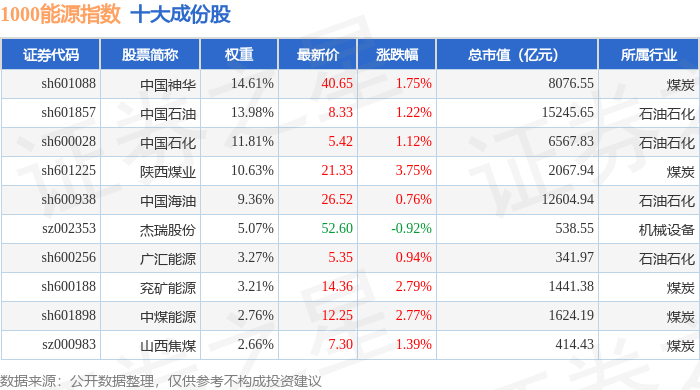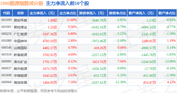 资金流向方面,1000能源(399381)指数成份股当日主力资金净流入合计3.27亿元,游资资金净流出合计1.32亿元,散户资金净流出合计1.95亿元。成份股资金流向详情见下表: