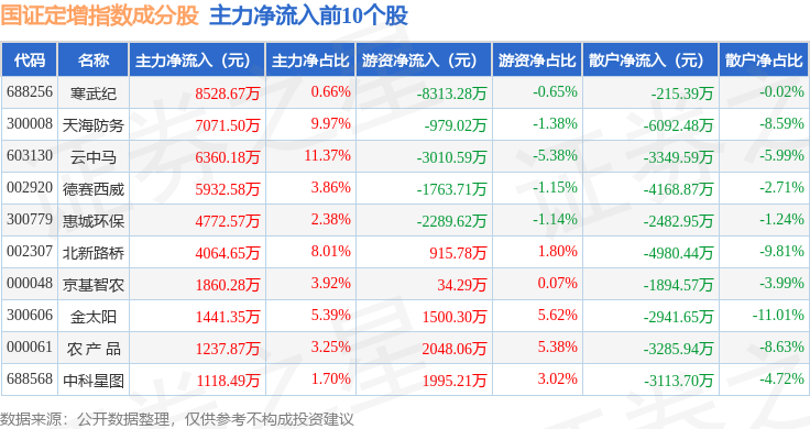 资金流向方面,国证定增(399428)指数成份股当日主力资金净流出合计40.38亿元,游资资金净流入合计14.72亿元,散户资金净流入合计25.66亿元。成份股资金流向详情见下表: