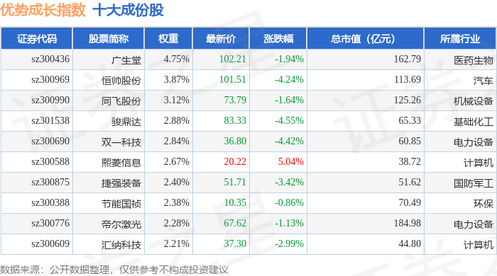 优势成长(399698)指数十大成份股详情如下: