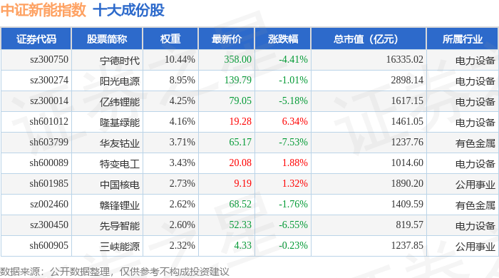 中证新能(399808)指数十大成份股详情如下: