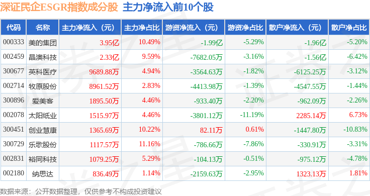资金流向方面,深证民企ESGR(470056)指数成份股当日主力资金净流出合计109.84亿元,游资资金净流入合计20.62亿元,散户资金净流入合计89.22亿元。成份股资金流向详情见下表:
