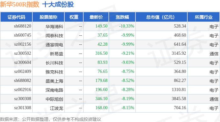 证券之星消息,10月14日,新华500R(489001)指数报收于7373.57点,跌1.45%,成交10765.74亿元,换手率1.33%。当日该指数成份股中,上涨的有192家,天合光能以8.39%的涨幅领涨,下跌的有295家,华海清科以10.33%的跌幅领跌。