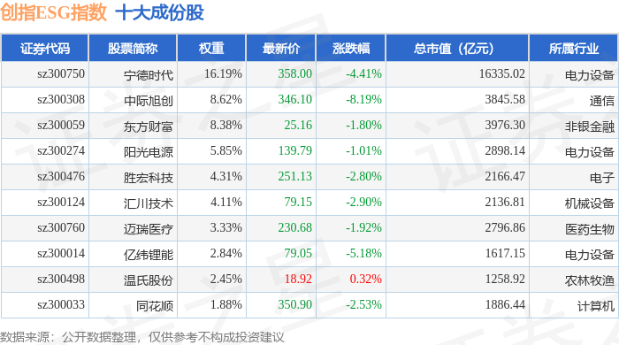资金流向方面,创指ESG(970028)指数成份股当日主力资金净流出合计137.59亿元,游资资金净流入合计49.15亿元,散户资金净流入合计88.44亿元。成份股资金流向详情见下表:
