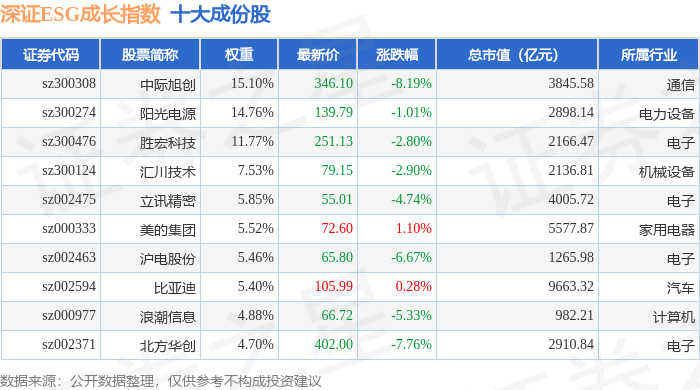 证券之星消息,10月14日,深证ESG成长(970060)指数报收于1957.35点,跌3.52%,成交1329.18亿元,换手率3.09%。当日该指数成份股中,上涨的有11家,英科医疗以12.69%的涨幅领涨,下跌的有39家,中际旭创以8.19%的跌幅领跌。