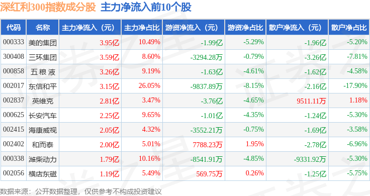 资金流向方面,深红利300(970062)指数成份股当日主力资金净流出合计107.31亿元,游资资金净流入合计14.13亿元,散户资金净流入合计93.17亿元。成份股资金流向详情见下表: