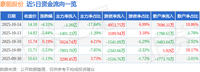 10月14日的资金流向数据方面,主力资金净流出1.26亿元,占总成交额17.84%,游资资金净流入4953.75万元,占总成交额6.99%,散户资金净流入7696.11万元,占总成交额10.86%。