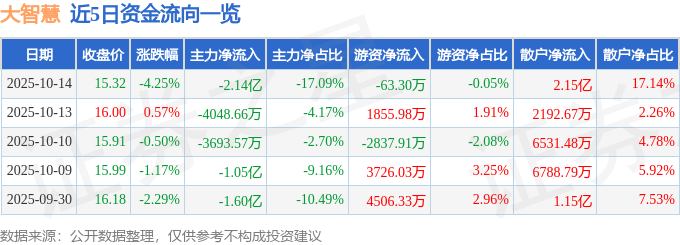 证券之星消息,截至2025年10月14日收盘,大智慧(601519)报收于15.32元,下跌4.25%,换手率4.01%,成交量79.69万手,成交额12.52亿元。