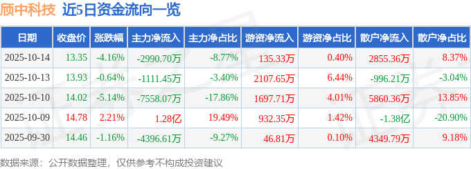 10月14日的资金流向数据方面,主力资金净流出2990.7万元,占总成交额8.77%,游资资金净流入135.33万元,占总成交额0.4%,散户资金净流入2855.36万元,占总成交额8.37%。