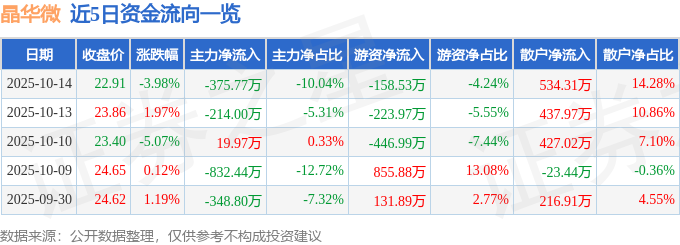 证券之星消息,截至2025年10月14日收盘,晶华微(688130)报收于22.91元,下跌3.98%,换手率2.65%,成交量1.6万手,成交额3740.95万元。