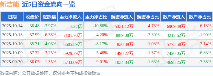 证券之星消息,截至2025年10月14日收盘,新洁能(605111)报收于36.48元,下跌3.97%,换手率7.32%,成交量30.4万手,成交额11.28亿元。