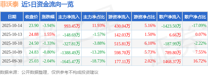证券之星消息,截至2025年10月14日收盘,菲沃泰(688371)报收于23.9元,下跌3.94%,换手率1.02%,成交量3.43万手,成交额8328.15万元。