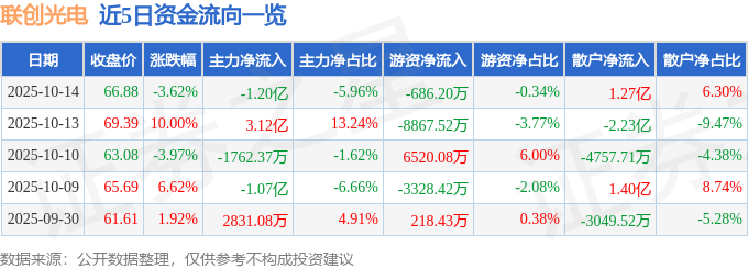 证券之星消息,截至2025年10月14日收盘,联创光电(600363)报收于66.88元,下跌3.62%,换手率6.45%,成交量29.23万手,成交额20.18亿元。
