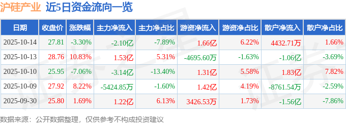 证券之星消息,截至2025年10月14日收盘,沪硅产业(688126)报收于27.81元,下跌3.3%,换手率3.48%,成交量95.07万手,成交额26.64亿元。