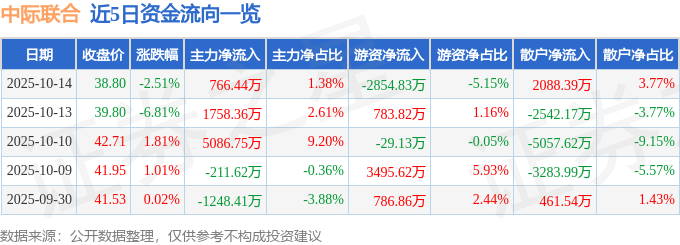 证券之星消息,截至2025年10月14日收盘,中际联合(605305)报收于38.8元,下跌2.51%,换手率6.47%,成交量13.74万手,成交额5.54亿元。