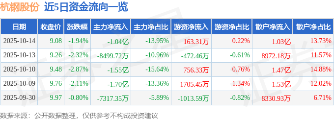 证券之星消息,截至2025年10月14日收盘,杭钢股份(600126)报收于9.08元,下跌1.94%,换手率2.41%,成交量81.28万手,成交额7.48亿元。