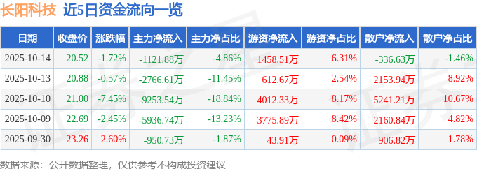证券之星消息,截至2025年10月14日收盘,长阳科技(688299)报收于20.52元,下跌1.72%,换手率3.84%,成交量11.03万手,成交额2.31亿元。