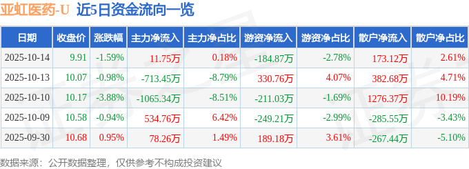 证券之星消息,截至2025年10月14日收盘,亚虹医药(688176)报收于9.91元,下跌1.59%,换手率1.52%,成交量6.62万手,成交额6642.96万元。