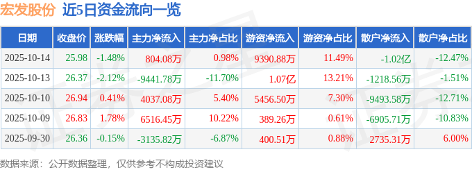 证券之星消息,截至2025年10月14日收盘,宏发股份(600885)报收于25.98元,下跌1.48%,换手率2.12%,成交量30.97万手,成交额8.17亿元。
