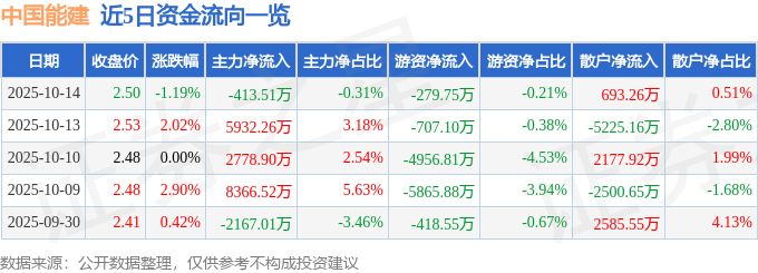 证券之星消息,截至2025年10月14日收盘,中国能建(601868)报收于2.5元,下跌1.19%,换手率1.66%,成交量537.28万手,成交额13.52亿元。