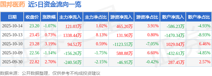 证券之星消息,截至2025年10月14日收盘,国邦医药(605507)报收于23.2元,下跌1.07%,换手率1.69%,成交量5.09万手,成交额1.19亿元。