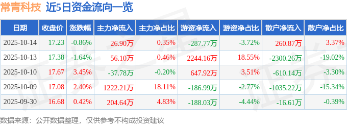 证券之星消息,截至2025年10月14日收盘,常青科技(603125)报收于17.23元,下跌0.86%,换手率4.41%,成交量4.47万手,成交额7741.9万元。