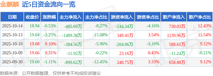 10月14日的资金流向数据方面,主力资金净流出485.69万元,占总成交额8.27%,游资资金净流出244.34万元,占总成交额4.16%,散户资金净流入730.03万元,占总成交额12.43%。